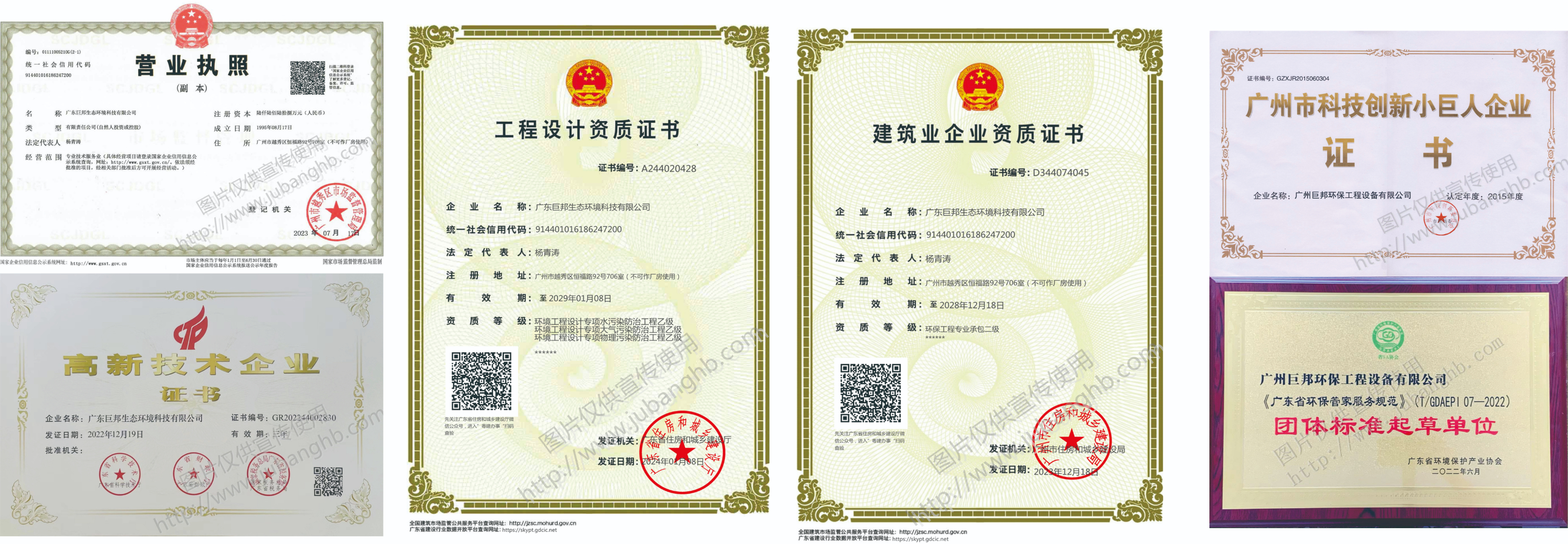 巨邦公司屬國(guó)家高新企業(yè),擁有國(guó)家住建部頒發(fā)的環(huán)保工程設(shè)計(jì)乙級(jí)資質(zhì)(工業(yè)廢氣處理、有機(jī)廢氣處理、廢氣治理、噪聲治理);擁有廣東省住建廳頒發(fā)的建筑企業(yè)環(huán)保專項(xiàng)承包貳級(jí)資質(zhì);廣東污水處理公司擁有中環(huán)協(xié)北京認(rèn)證中心認(rèn)證的工業(yè)污水、生活污水二級(jí);并已取得ISO9001、ISO14001、OHSAS18001認(rèn)證。
